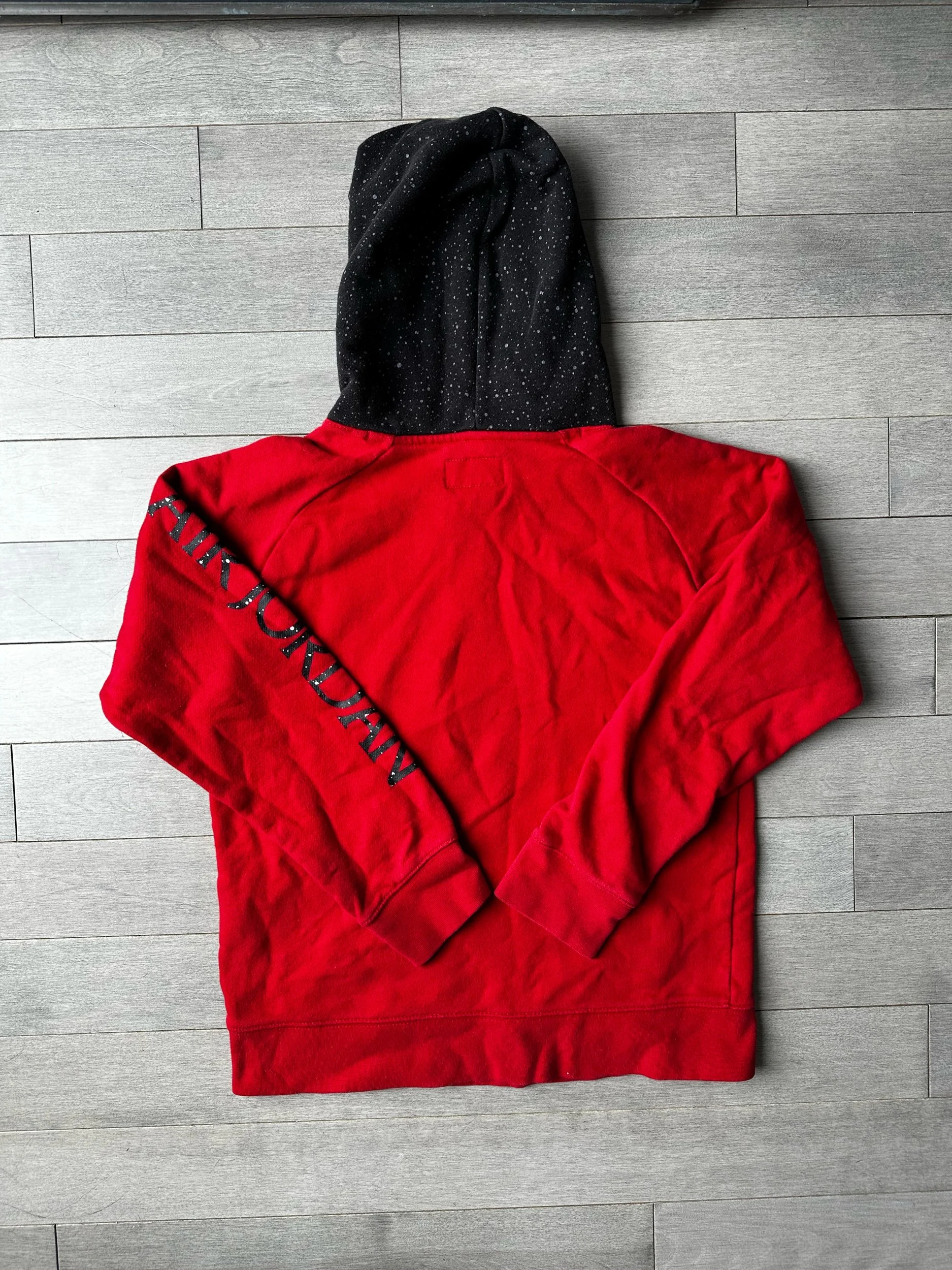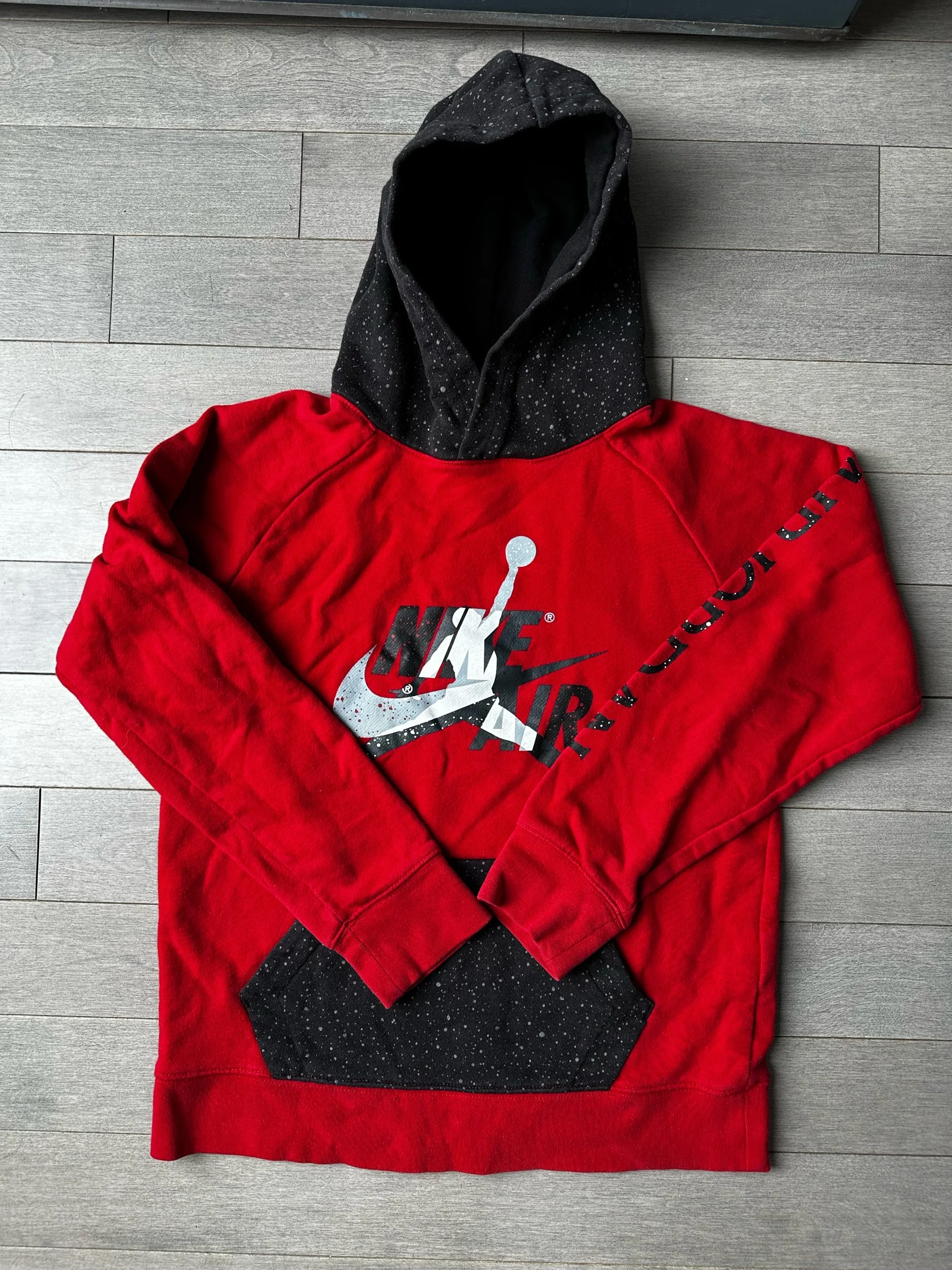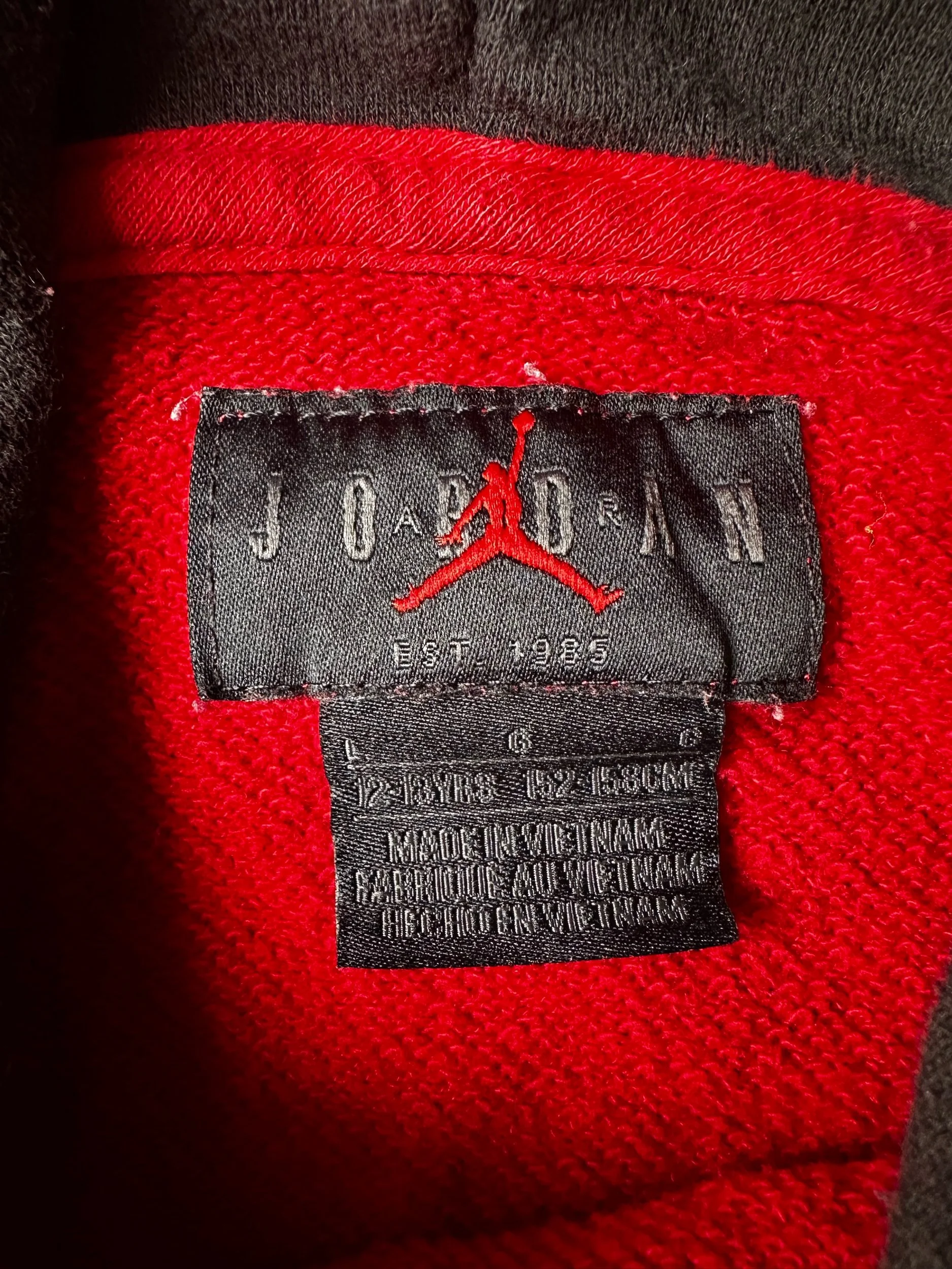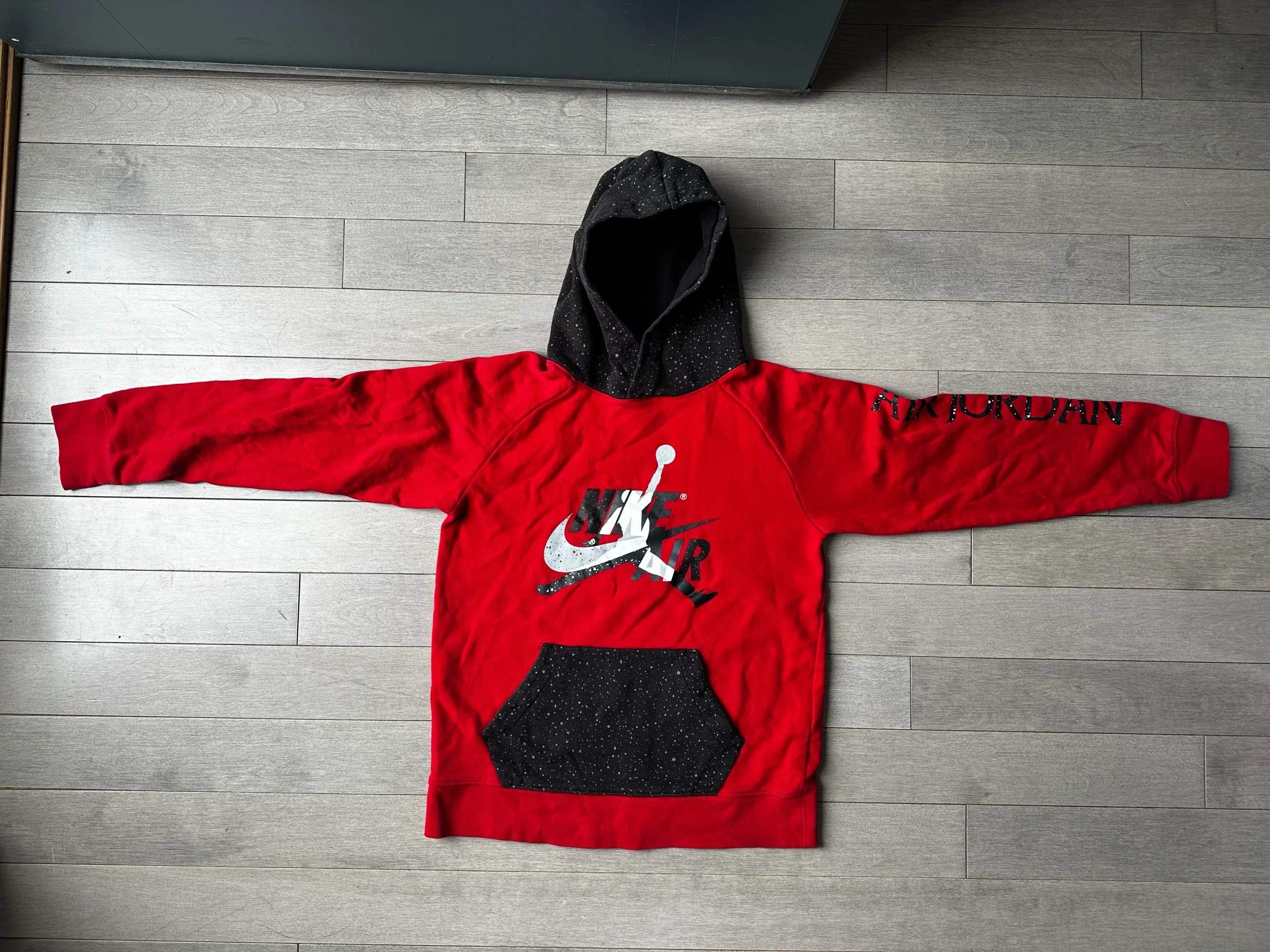 The Boys Red and Black Jordan Jumpman Classics Pullover Hoodie Sweatshirt in size Large is a stylish and comfortable addition to any young boy's wardrobe. Featuring the iconic Jordan Jumpman logo, this classic fit hoodie is perfect for casual wear. The bold red color adds a pop of color to any outfit, making it a versatile piece for everyday wear. Made with quality materials, this hoodie is sure to keep your little one warm and stylish during the cooler months.